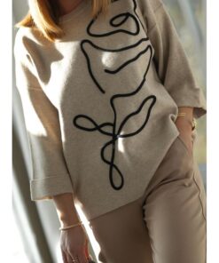 Pull à coupe droite, manches 3/4 plus larges, encolure ronde. Décoré sur le devant d’un ruban cousu en forme de fleur. Taille universelle.